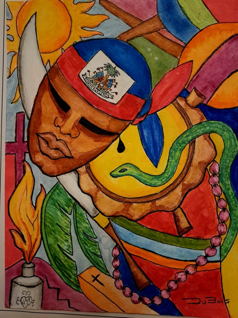 My Artwork to me has always been a source of therapy, it would take me away from whatever I was going through. Most of my work is monochromatic, but I Chose to be in a better place mentally and decided to express myself using brighter color. I decided for the first time to use watercolor in my linear drawings. This particular piece is part of a collection I entitled » Revolution ». My goal was to stimulate the viewers mind as different symbols and objects are discovered. My mother instilled in me a great sense of pride for our beloved country, HAITI. I am forever grateful to my Mom for sending me to Haiti at the age of twelve for the summer. It was then I visited Des Cayes. She took me to my Great-grandfather’s property in Matino, where my umbilical cord was buried with a coconut seed along with my ancestors, the youngest tree was mine. I believe my Mom was the last to follow the tradition. This African tradition symbolizes that we will forever be together in spirit. I sometimes incorporate the Haitian flag in my pieces as a symbol of my patriotism.