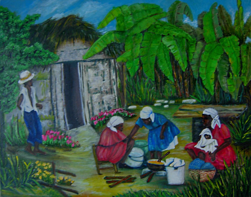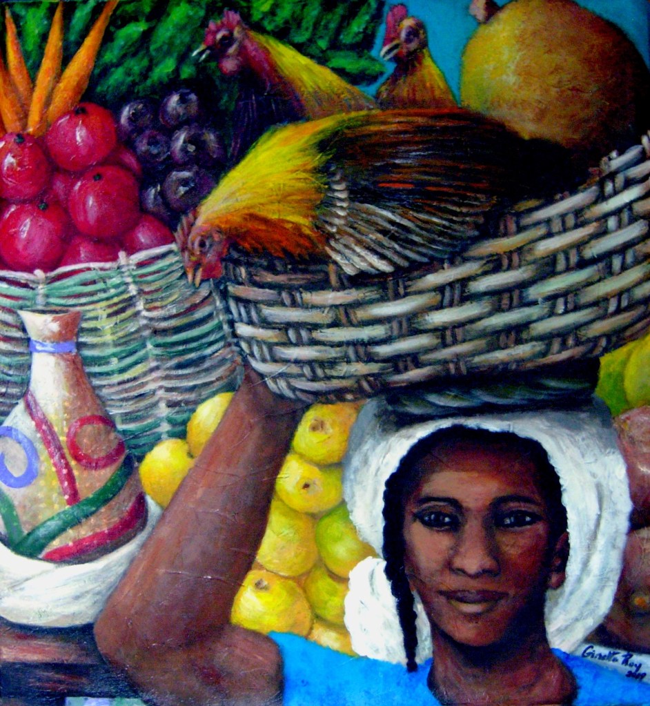 In her approach, she appropriates familiar objects such as jars, jugs, calabashes, govi, etc. used by Haitian and African women. For the artist, these objects become the confidants of these women and are one with them. To paint: it is to say, it is to cry, it is to sing, it is a pleasure for the observant eyes, it is escape, it is to smile at life, it is to live.