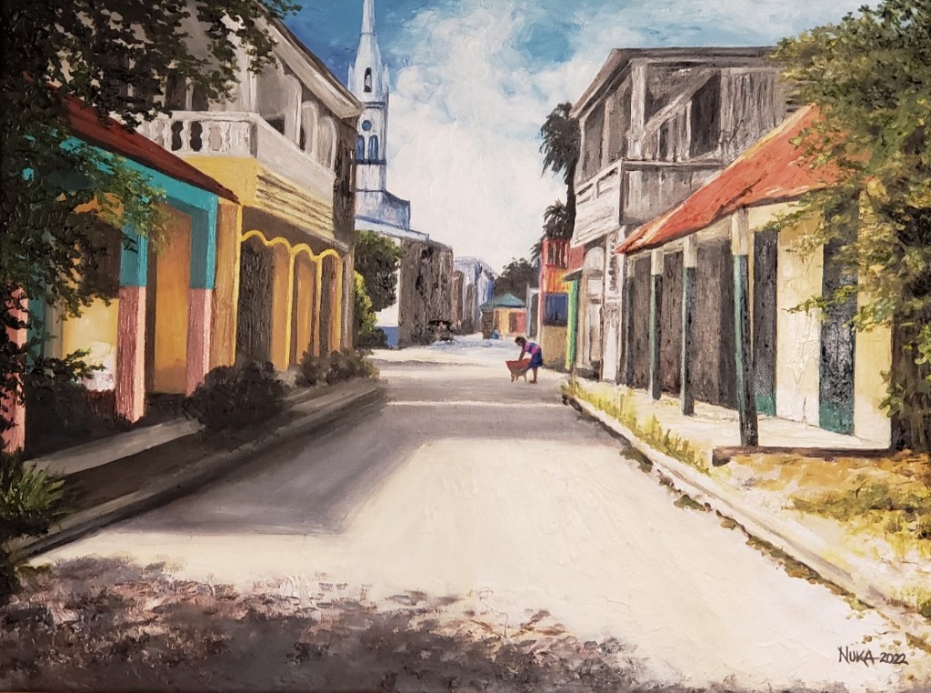 Dans ce tableau, intitulé Cavaillon Street, Nuka capture le cœur de Cavaillon, Haïti, la ville natale de sa défunte mère avant qu’elle ne soit dévastée par un tremblement de terre majeur en août 2021.